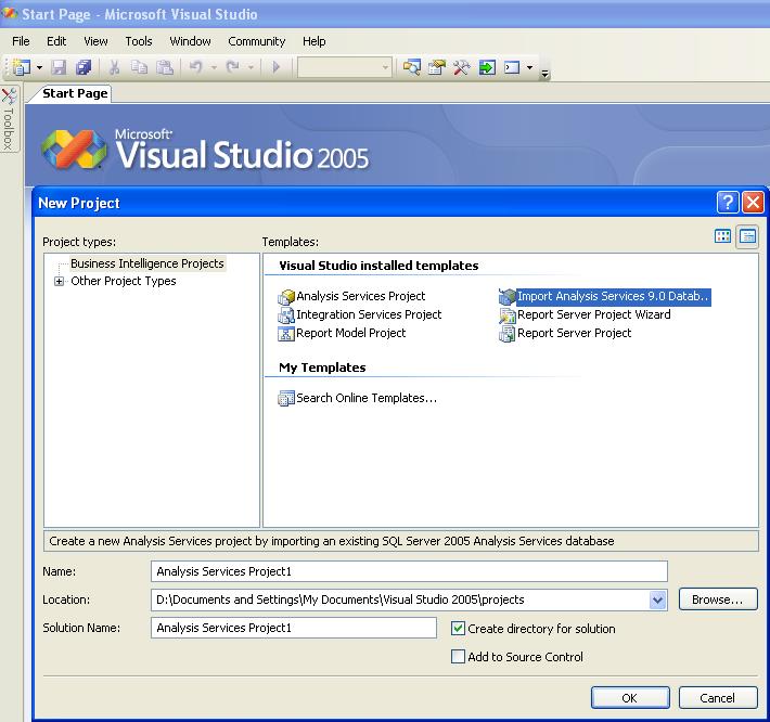 Select the Import Analysis Services option and after giving the required Name, Location and Solution Name, click OK.